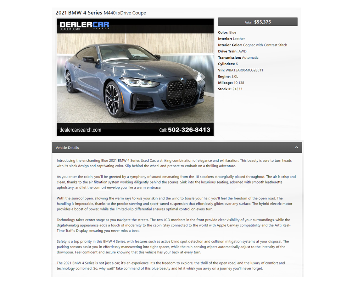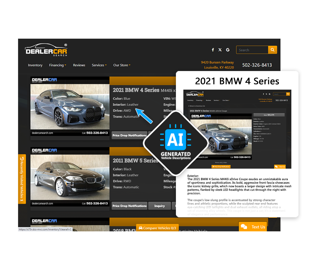 Ready to revolutionize your dealership's online listings? Contact our team to learn more about AI Generated Vehicle Descriptions and how it can elevate your business. Say goodbye to time-consuming descriptions and hello to AI-powered efficiency! Your customers will thank you, and your sales will soar!