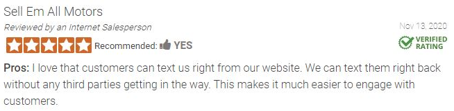 95% of text messages are opened and responded to within 3 minutes of being delivered. Generate more leads and appointments via website texting. Your customers are using one of the most responsive methods of communication possible to buy cars. Your Dealership should too!